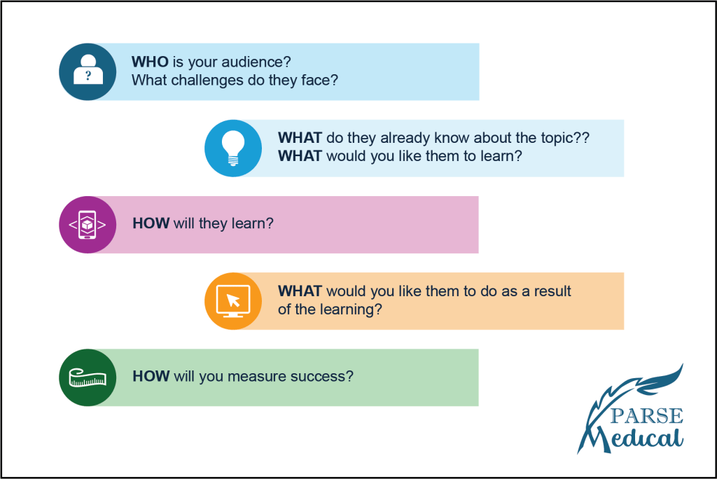 At Parse Medical, before starting to work on the educational materials, we ask a few questions 👇 – they help us understand the audience, the task and the desired outcome of education! Note that these tips apply to both internal and external medical education.